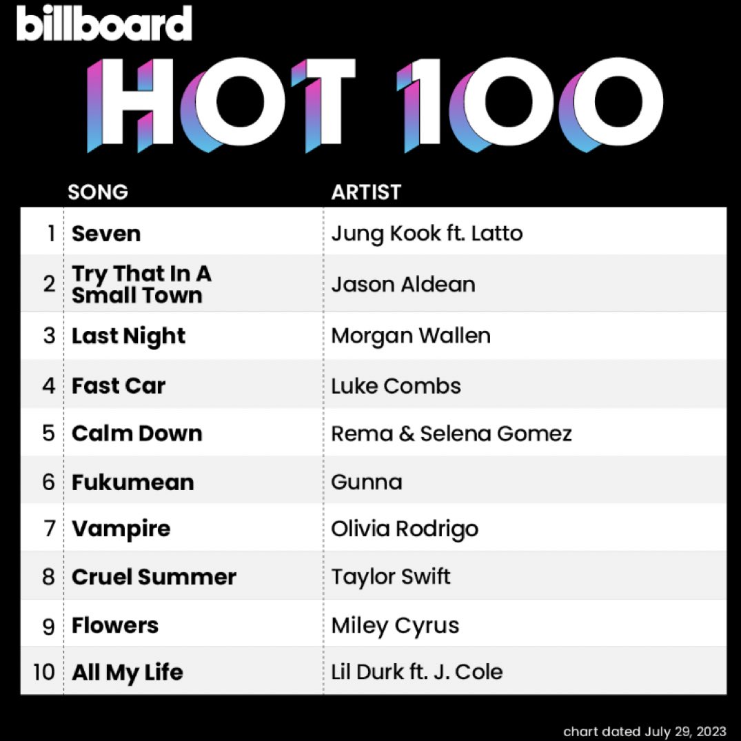 Seven을 이 합산 수치로 계산해보면  7월 14일부터 7월 20일까지 기간 동안 2,190만 스트림, 640만 방송 시청자, 153,000개의 통합 디지털 및 CD 싱글 판매로 Hot 100에서 1위를 차지하게 되었는데 정말 대단합니다.