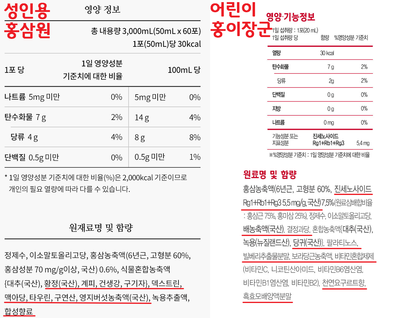 어린이용은 특이하게 진세노사이드를 명시했어요. 그런데 진세노사이드는 홍삼에 일반적으로 들어있는 성분이기 떄문에 성인용에 이 성분이 안들어 간 건 아니예요. 아마도 특별하게 어린이용에서 항산화 효과를 더 강조하기 위해 마케팅용으로 원료명을 일부러 더욱 세밀하게 작성해 놓은 느낌이예요.