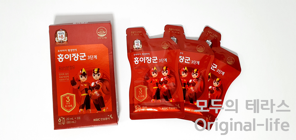 왼쪽은 성인용 홍삼원 골드, 오른쪽은 어린이용 홍이장군이예요.