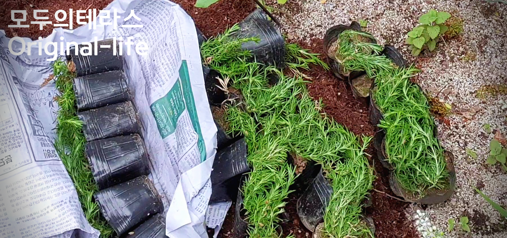 이제 꽃잔디 포트 크기만하게 고랑을 파내면서 2개씩 포개어 줄지어 심어봤어요!