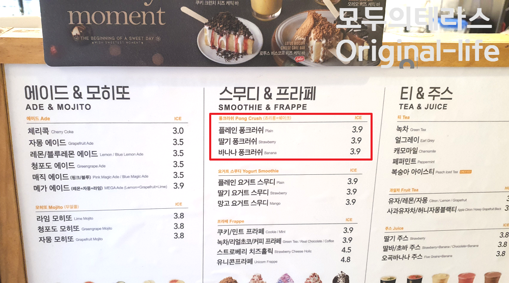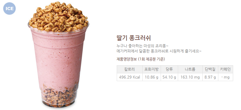 근데 홈페이지에서 보니까, 딸기 퐁크러쉬는 496kcal, 바나나 퐁크러쉬는 622kcal더라구요. 뭐지..암튼.