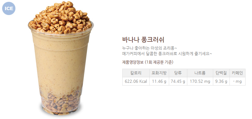 근데 홈페이지에서 보니까, 딸기 퐁크러쉬는 496kcal, 바나나 퐁크러쉬는 622kcal더라구요. 뭐지..암튼.