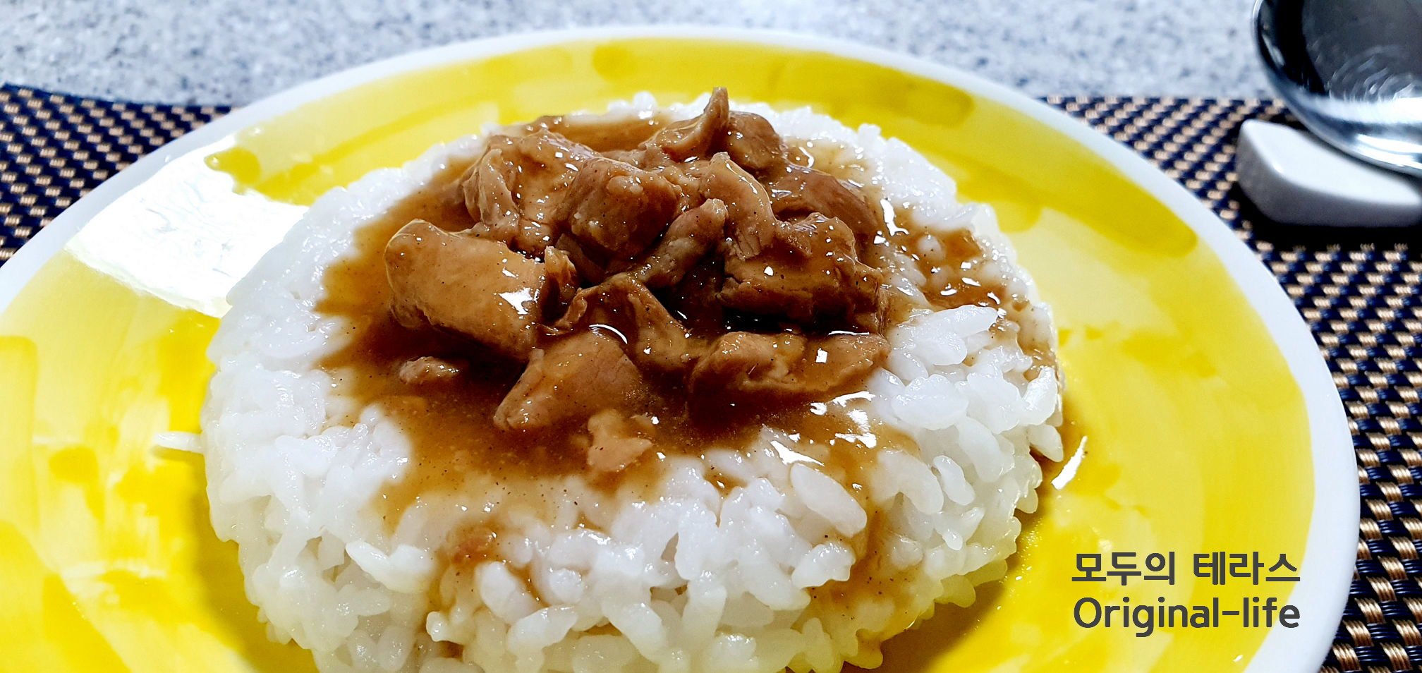 윤기나는 햇반 위에 간장 닭고기를 부어주었는데