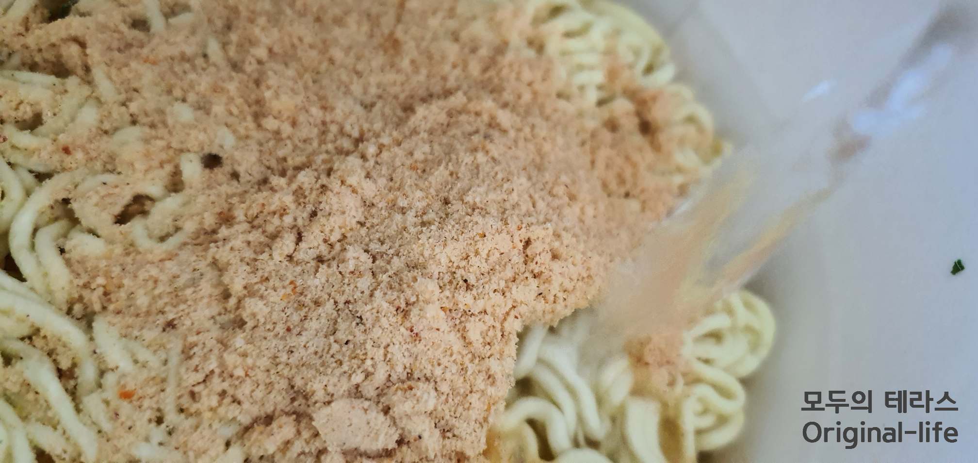 꼬꼬면은 육수의 느낌을 내기 위해 빨간 스프가 아닌 백색 스프가 들어있어요.
