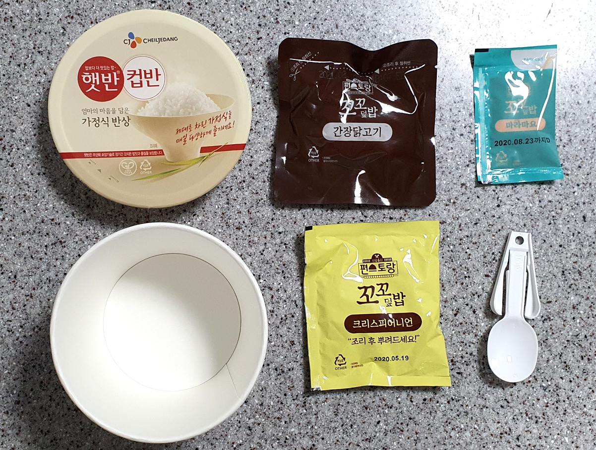 컵반 작은거 하나, 봉지 닭고기, 뿌려먹는 크리스피어니언, 마라마요, 1회용 수저