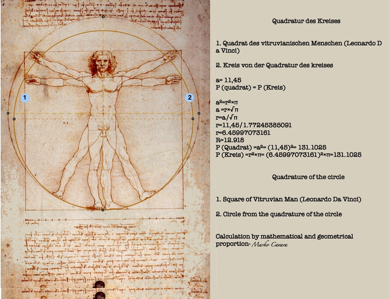 이 비율들은 특정한 수치로도 나타내었는데, 발의 길이는 키의 1/6, 팔뚝은 키의 1/4, 가슴너비도 키의 1/4 등 다른 각 인체의 부분들도 각각 대칭의 비율을 가지고 있다고 언급하며, 원과 정사각형 안에 인간을 배치하여 이상적인 비율을 만든다는 것입니다.