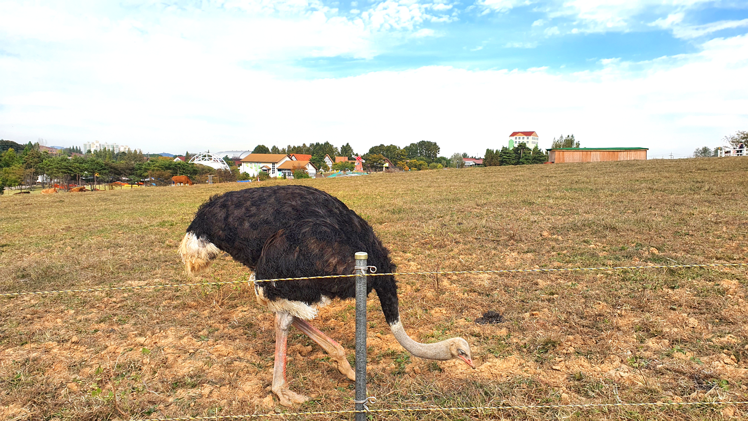 아니 동물 친구들이 다 끝났는지 알았는데 꽃밭가는 길에 또 보이는 아이들ㅎㅎㅎ 황소랑 타조예요. 조합이 조금 웃기긴한데 얘네들이 또 한 군데에 모여있더라구요. 타조도 그냥 또 일상인지 도망가지 않고 알아서 자기 먹던거 먹으면서 먹는 길 가는 중이에요.