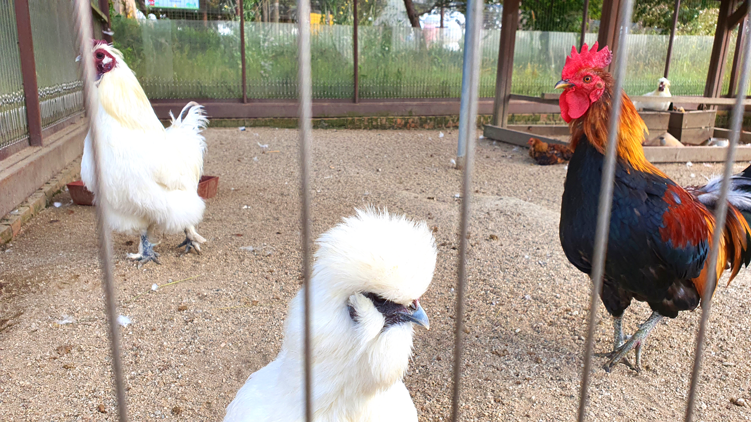 말 사육장 밑 쪽으로 나가면서 본 오골계랑 수탉 사육장인데 저는 저렇게 화끈하게 생긴 닭은 처음 봤어요. 심지어 관리가 잘되어 있어서 털들도 깨끗하고 애들이 토실토실하게 건강하더라구요. 저 하얀 머리 닭은 머리를 만져보고 싶었는데 손가락 쪼아먹을까봐 무서워서 나뭇가지만 흔들다가 나왔어요.