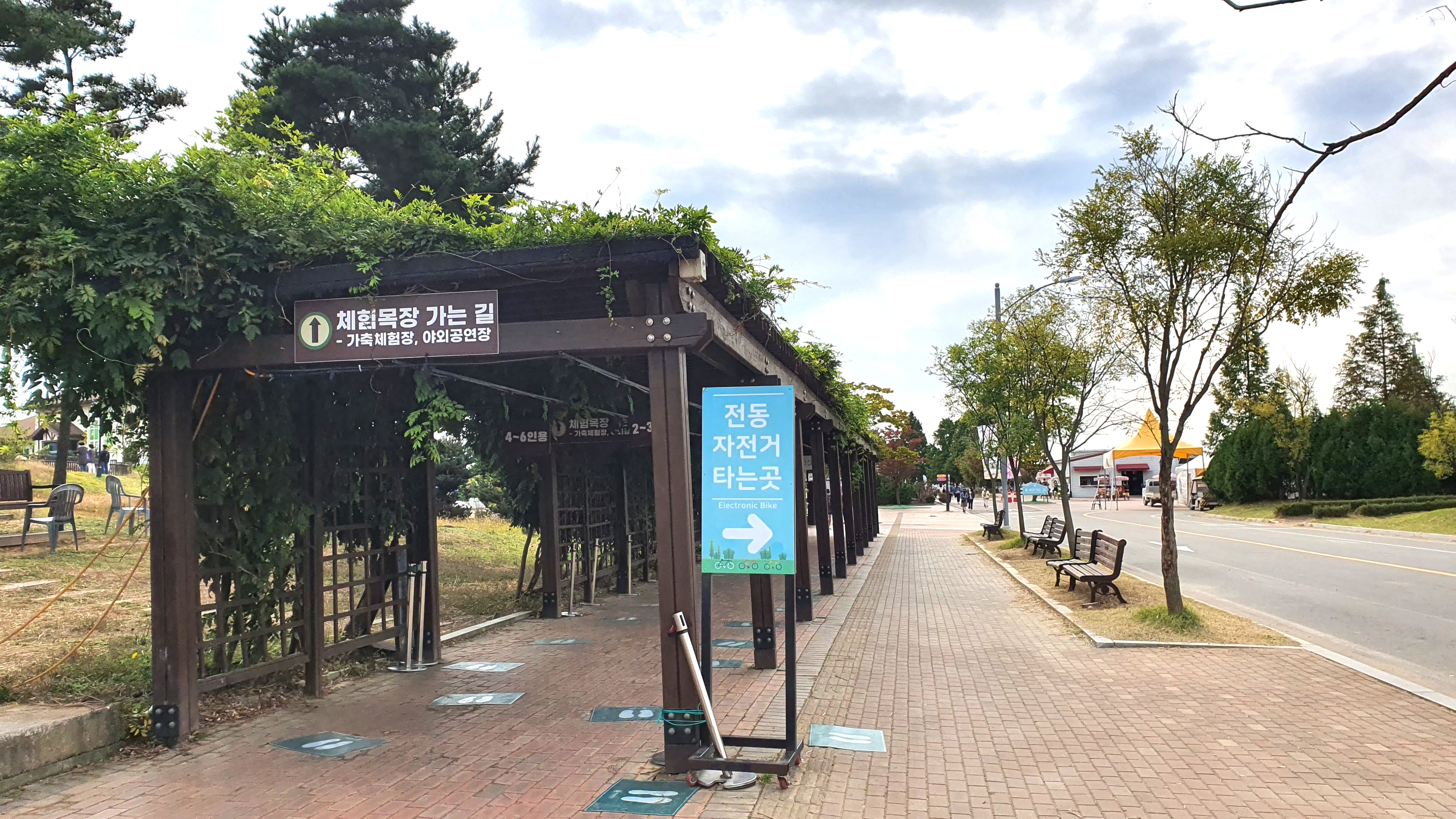 동물 농장 가는 길에 나무 울타리로 터널을 만들어 놓았는데, 아직 애매한 가을 이다보니, 알록한게 아니라 푸르른 터널이에요ㅎㅎ 여기 오른편에는 전동 자전거라고 4인승 네발달린 큰 전기자전거를 대여할 수 있는데 걷기 힘들거나 나이드신 분들이 이용하시는데 이건 단점이 꽃밭까지도 못가고 팜랜드를 크게 돌고 오는 도로만 타야 해서 안타는 걸 추천해요.