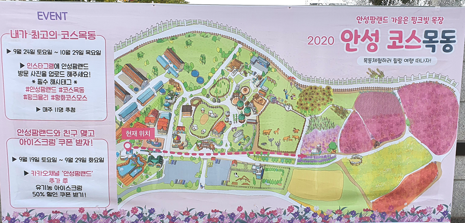 입구에서 들어가면 바로 오른쪽에 안성팜랜드 지도가 있어요. 저희는 코스모스와 핑크뮬리를 보기 위해 방문한 것이기 때문에 지도를 따라서 바로 오른쪽으로 쭉 가려고 했으나ㅎㅎ 바로 왼편부터 각가지 동물들이 자리를 잡고 있는 동물 농장을 발견해서 동물 농장을 우선 가보기로 했어요.