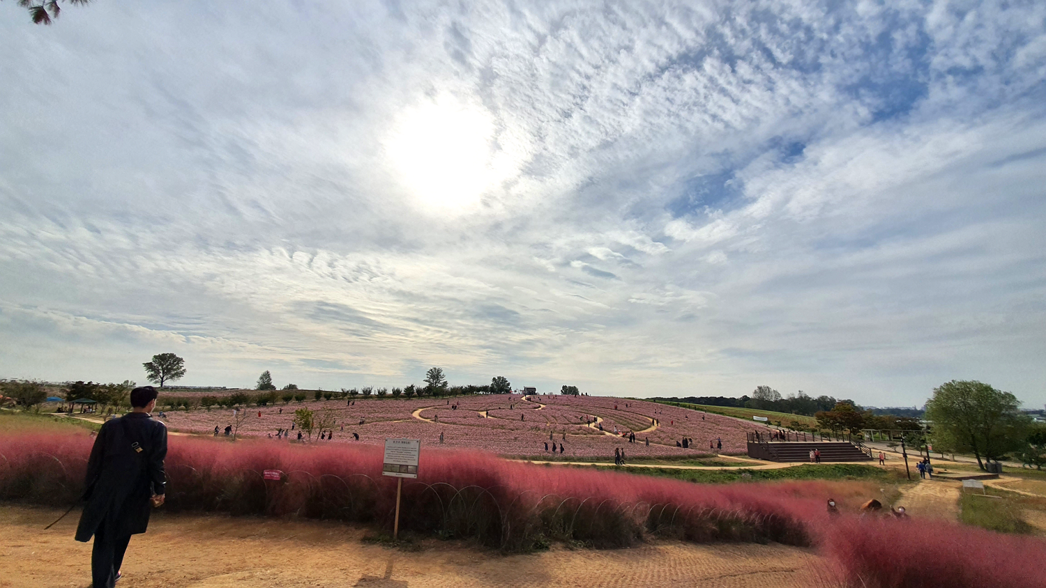 드디어 나타난 코스모스 길과 핑크뮬리길! 이렇게 아까 그 바람개비 길을 올라서면 넓게 펼쳐진 코스모스밭과 핑크뮬리 단지가 펼쳐져 있어요! 아니 대체 이게 몇송이인지! 저정도의 코스모스라면 아마도 수만 송이의 꽃이 심어져 있는 것 같았어요!