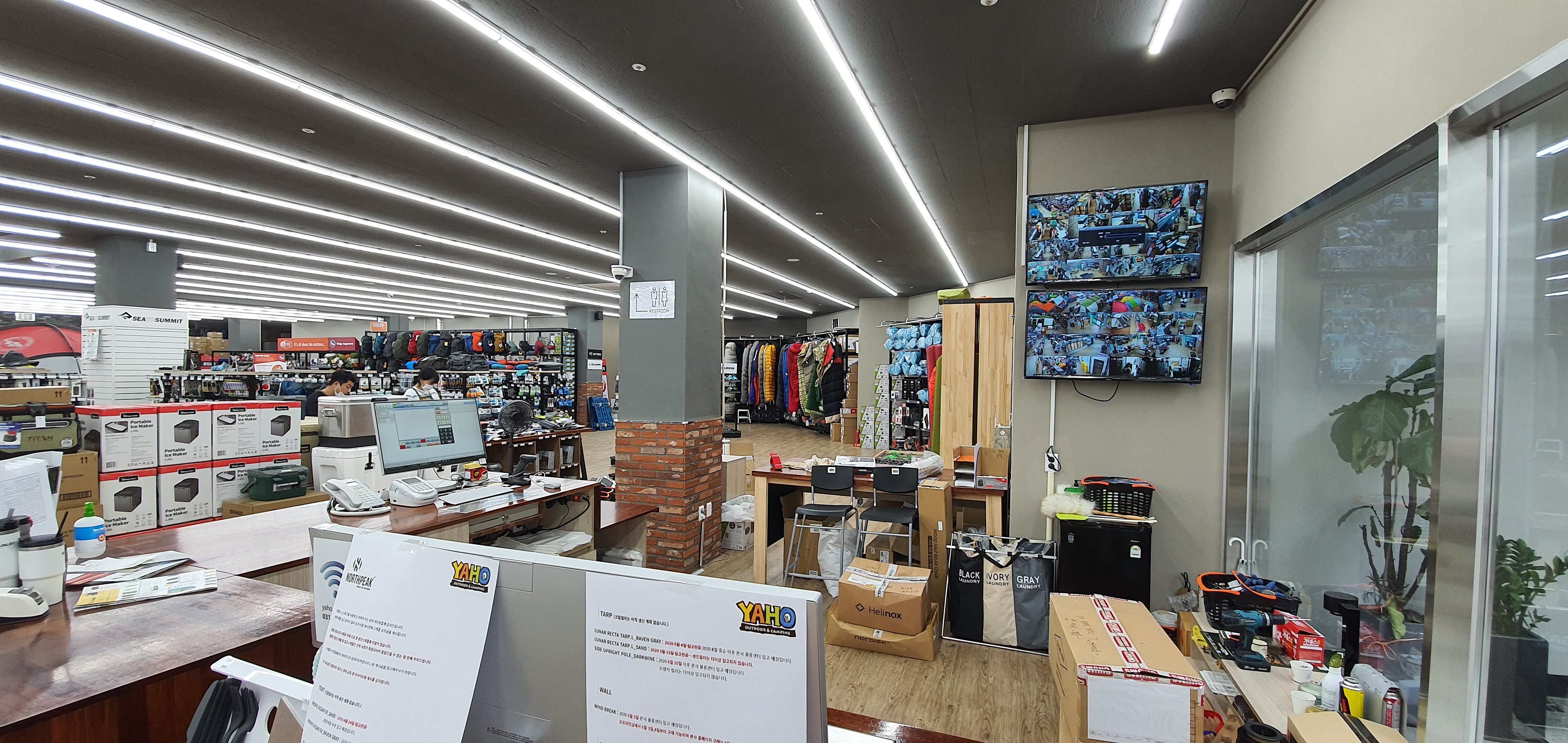신축 건물 지하에 오픈했기 때문에 정말 깔끔하고 깨끗했습니다. 카운터에서 보이는 CCTV가 엄청 많죠? 훔쳐가면 철컹철컹 조심해야 합니다. 저렇게 많은 CCTV가 있는 이유는 그만큼 수많은 캠핑용품들이 있기 때문에 직접 눈으로 볼게 정말 많습니다.