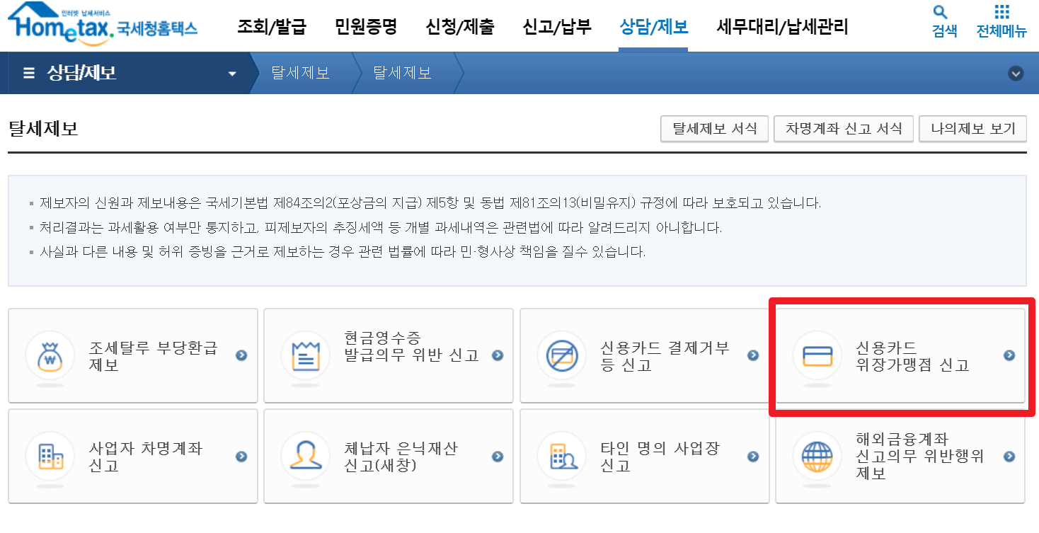 여러가지 메뉴들 중에서 [신용카드 위장가맹점 신고] 메뉴로 들어갑니다.