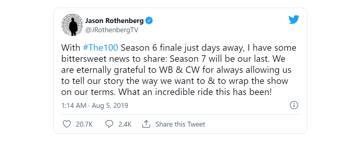 With #The100 Season 6 finale just days away, I have some bittersweet news to share: Season 7 will be our last. We are eternally grateful to WB & CW for always allowing us to tell our story the way we want to & to wrap the show on our terms. What an incredible ride this has been!