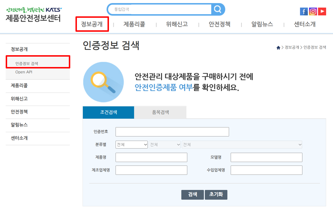 1. 정보공개 메뉴 → 인증정보 검색 선택