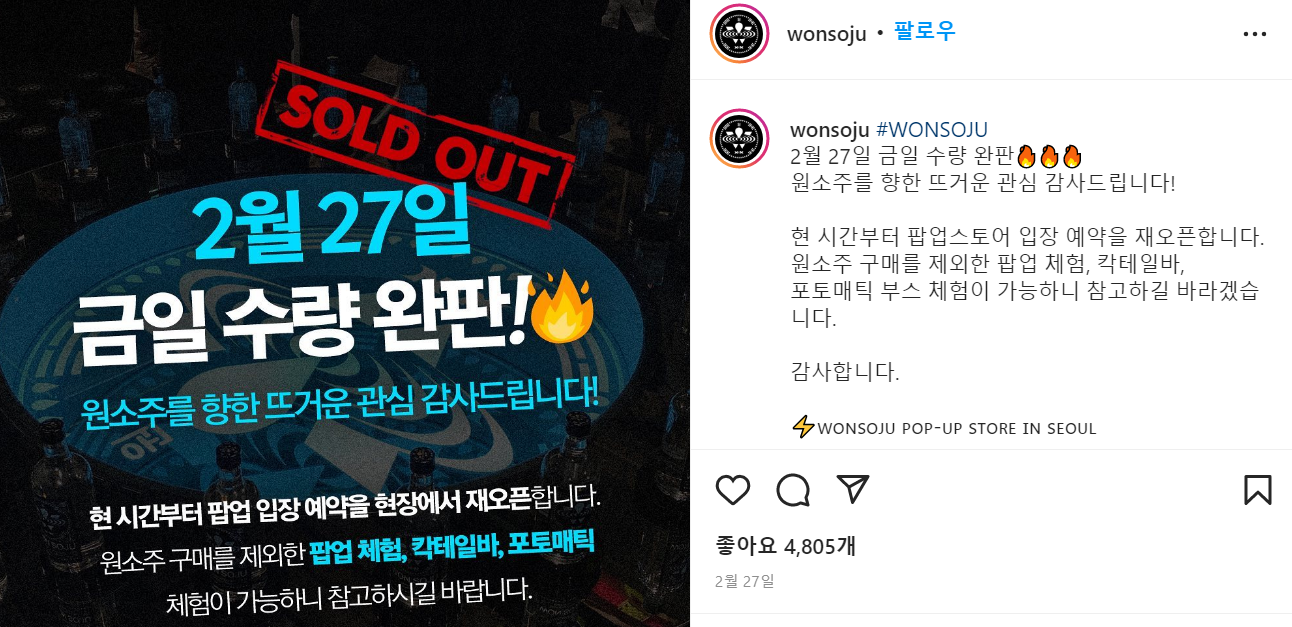 심지어, 소비자들의 엄청난 요청에 따라 3월 16일부터 가로수길의 NICE WEATHER MARKET에서 진행된 2차 팝업 스토어에서도 행사 전날부터 줄을 서는 대기 행렬이 이어지면서 2차 팝업 스토어 행사에 준비되었던 원소주 1만병이 완판되어버리는 등 일반 소비자들에게 '요즘 제일 핫한 술'이라는 인식을 단번에 심어주었습니다.